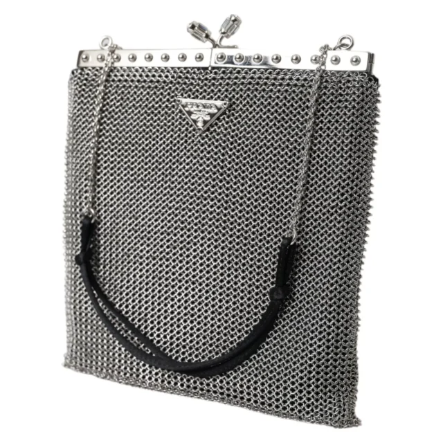 Crafted in Italy with meticulous attention to detail, the Prada bandoliera bag boasts a minimalist yet captivating design. The compact size and snap-clasp fastening offer both practicality and style, ensuring easy access to your essentials while keeping your look effortlessly chic. The unique blend of metal mesh and leather brings a refined yet edgy feel to this evening bag, making it an absolute must-have for fashion-forward individuals.