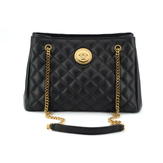 This tote bag is crafted from premium quilted Nappa leather, giving it a soft yet durable finish. The signature Medusa head logo on the front adds a touch of iconic Versace charm. With its spacious main compartment and interior zip pocket, it offers ample room for your daily essentials. The gold-tone hardware and chain strap with a leather handle provide versatility and comfort, ensuring you can carry it effortlessly in any setting. Measuring 11.8 inches x 7.1 inches x 4.3 inches, with a 23.6-inch strap, this tote is perfectly sized for both functionality and style.