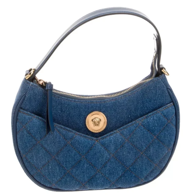 This Versace top handle bag stands out with its unique blend of denim and leather materials, creating a striking yet versatile design. The compact size ensures convenience without compromising style, while the metal hardware adds a polished finish. Its adaptable design allows it to transition effortlessly from casual daywear to elegant evening looks. Whether carried by the top handle or worn as a crossbody, this bag is a statement piece that complements any outfit.